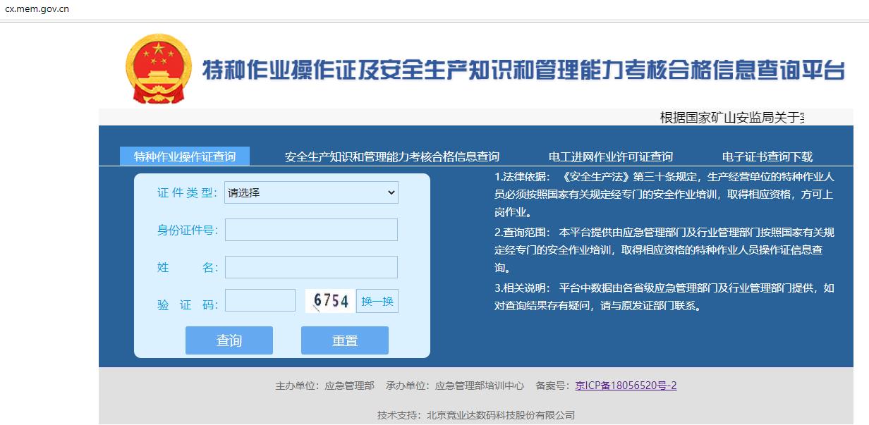 四、如何查驗(yàn)證書真?zhèn)危?BR> (一)對(duì)于舊版證書。必須使用“特種作業(yè)操作證及安全生產(chǎn)知識(shí)和管理能力考核合格信息查詢平臺(tái)”查驗(yàn)證書真?zhèn)巍?BR> 直接輸入網(wǎng)址(http://cx.mem.gov.cn/),或登錄應(yīng)急管理部網(wǎng)站(http://www.mem.gov.cn/),從“服務(wù)”中的“查詢服務(wù)”進(jìn)入“特種作業(yè)操作證及安全生產(chǎn)知識(shí)和管理能力考核合格信息查詢平臺(tái)”,查詢證書信息。