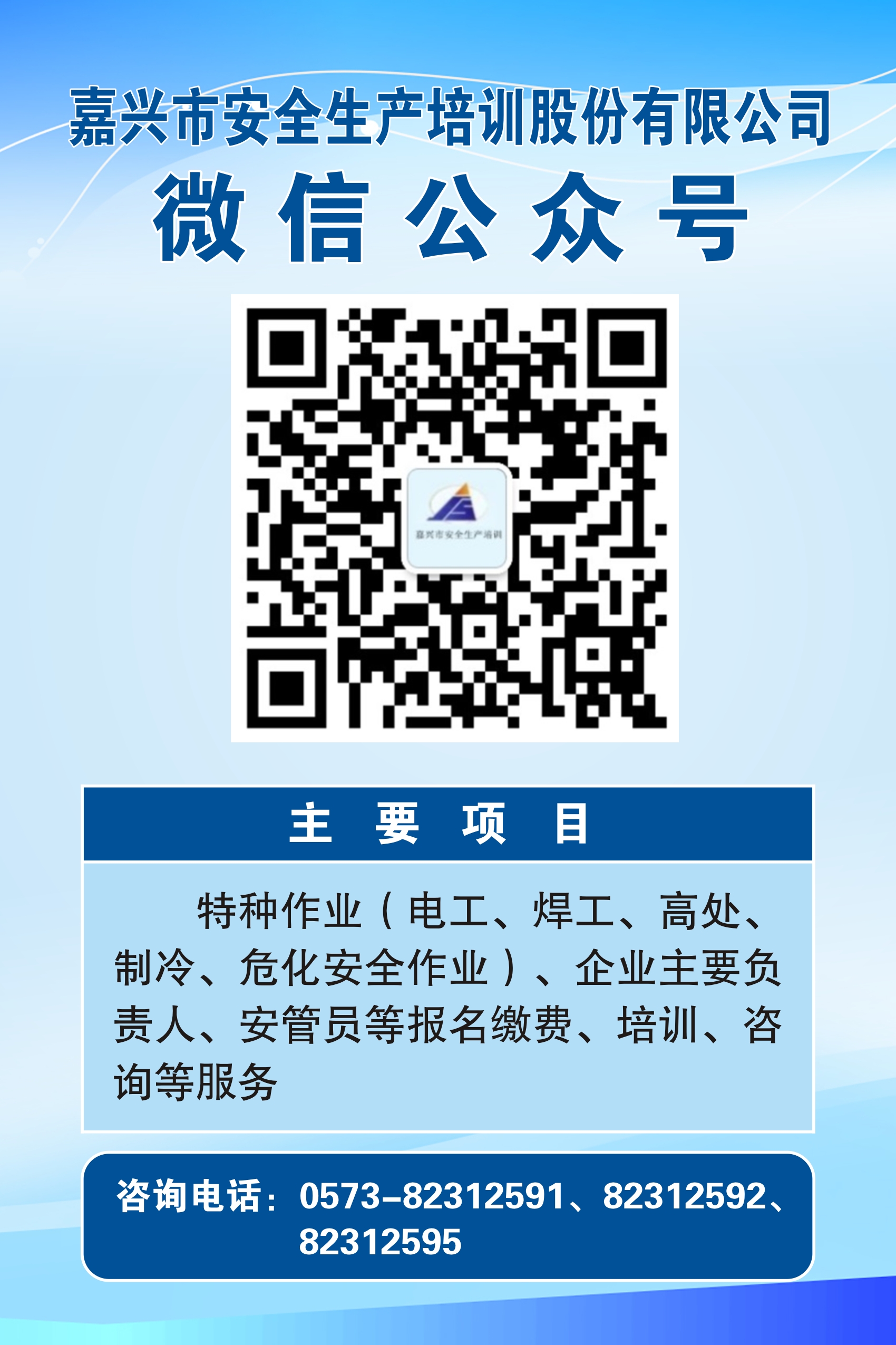 疫情期間,嘉興市安全生產培訓股份有限公司特種作業(yè)(焊工作業(yè)、高壓電工作業(yè)證、低壓電工證、;踩鳂I(yè)、高處作業(yè)、制冷與空調作業(yè)等)報名培訓考證均采用線上報名方式,可關注微信公眾號“嘉興市安全生產培訓”,進行報名操作。
