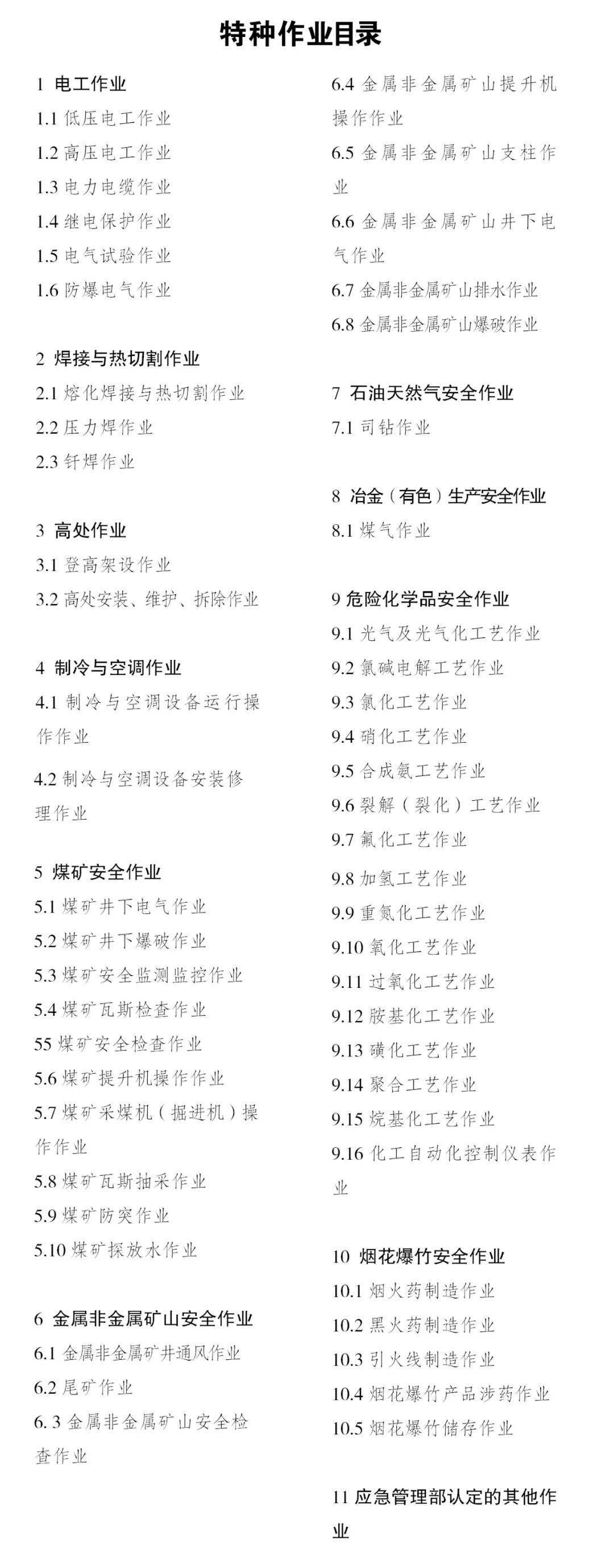 四、特種作業(yè)范圍有哪些? 根據(jù)《特種作業(yè)人員安全技術(shù)培訓(xùn)考核管理規(guī)定》的附件《特種作業(yè)范圍》和《關(guān)于做好特種作業(yè)(電工)整合工作有關(guān)事項(xiàng)的通知》(安監(jiān)總?cè)耸隆?018〕18號(hào)),包括11個(gè)類別54個(gè)操作項(xiàng)目(工種)。具體如下: