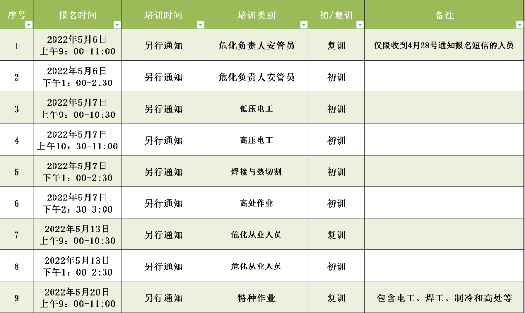 (三)線下報(bào)名所需資料 1.特種作業(yè)復(fù)訓(xùn) (1)報(bào)名申請(qǐng)表;(2)身份證原件;(3)一張1寸照片;(4)報(bào)名時(shí)請(qǐng)攜帶特種作業(yè)操作證原件。 2.;(fù)責(zé)人安管員初復(fù)訓(xùn) (1)填寫并提交《危險(xiǎn)物品生產(chǎn)經(jīng)營單位主要負(fù)責(zé)人、安管員安全培訓(xùn)申請(qǐng)登記表》,需由申請(qǐng)人簽字確認(rèn),并加蓋單位公章; (2)報(bào)名時(shí)請(qǐng)攜帶身份證原件;(3)兩寸免冠照1張;(4)公司營業(yè)執(zhí)照復(fù)印件;(5)復(fù)訓(xùn)人員需攜帶考核合格證件原件。 3.危化從業(yè)人員初復(fù)訓(xùn) (1)填寫并提交《;飞a(chǎn)經(jīng)營單位從業(yè)人員安全培訓(xùn)申請(qǐng)登記表》;(2)報(bào)名時(shí)請(qǐng)攜帶身份證原件;(3)兩寸免冠照1張(不著紅色上衣,背景為藍(lán)底或白底);(4)提供初中或初中以上學(xué)歷證明復(fù)印件。 4.特種作業(yè)初訓(xùn) (1)報(bào)名申請(qǐng)表;(2)身份證原件;(3)一張1寸照片;(4)初中及以上學(xué)歷證明復(fù)印件一份(或者戶口本本人頁復(fù)印件(含文化程度))。