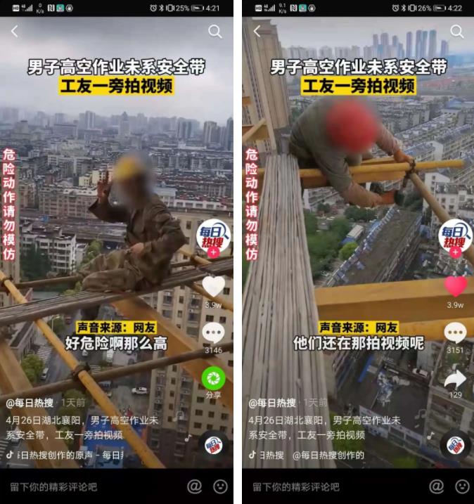 近日一則視頻引起熱議,多名工人高空作業(yè)不系安全帶,工友還拍視頻炫耀,令人揪心! 視頻中,一男子坐在腳手架上,雙腳懸空,對著鏡頭擺出“V”字手勢;另一名男子蹲在腳手架上,正在進(jìn)行高空作業(yè)。鏡頭可見遠(yuǎn)處可見大片高樓,二人身上均沒有系安全帶,令人不禁捏一把汗。