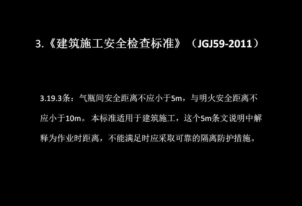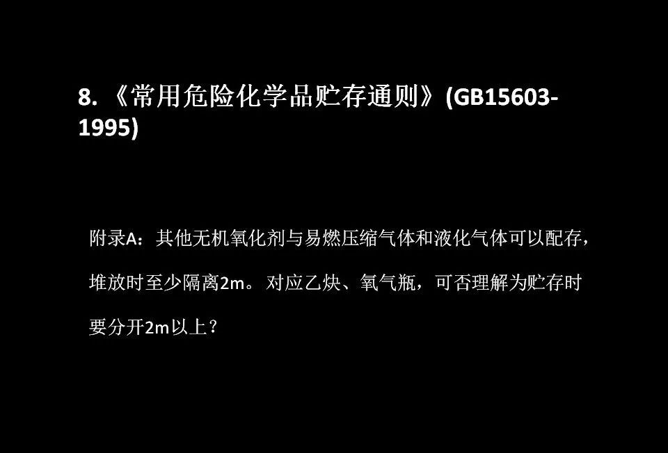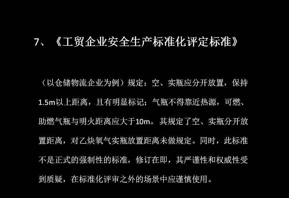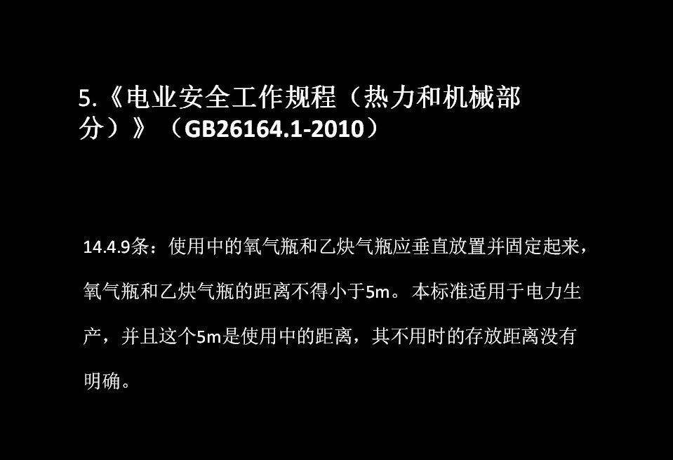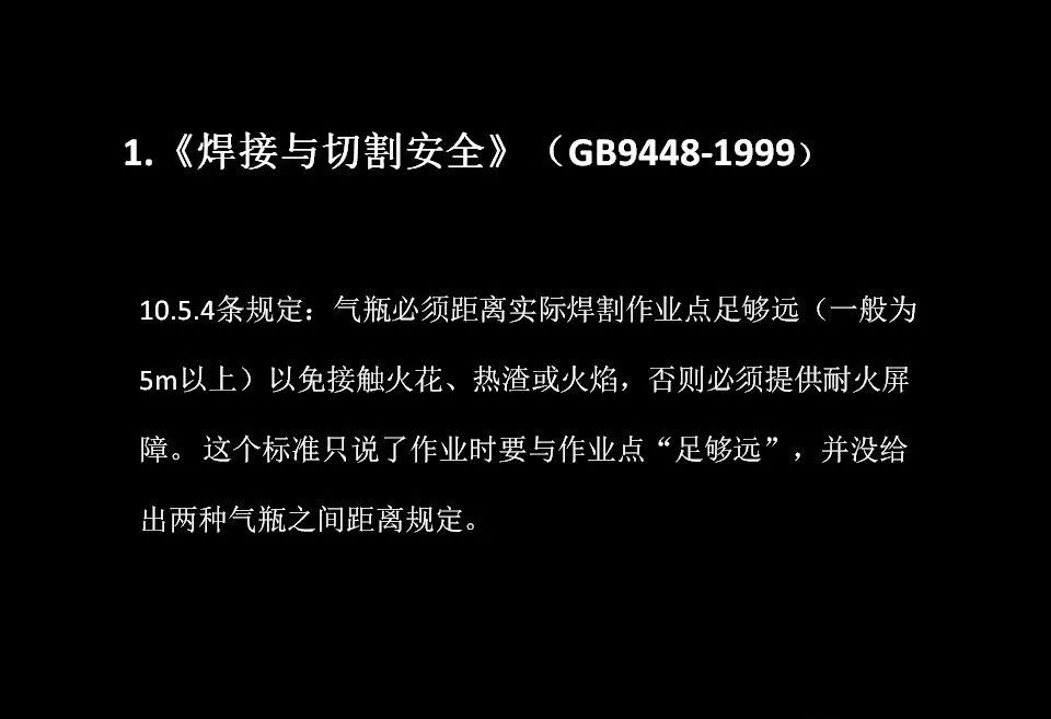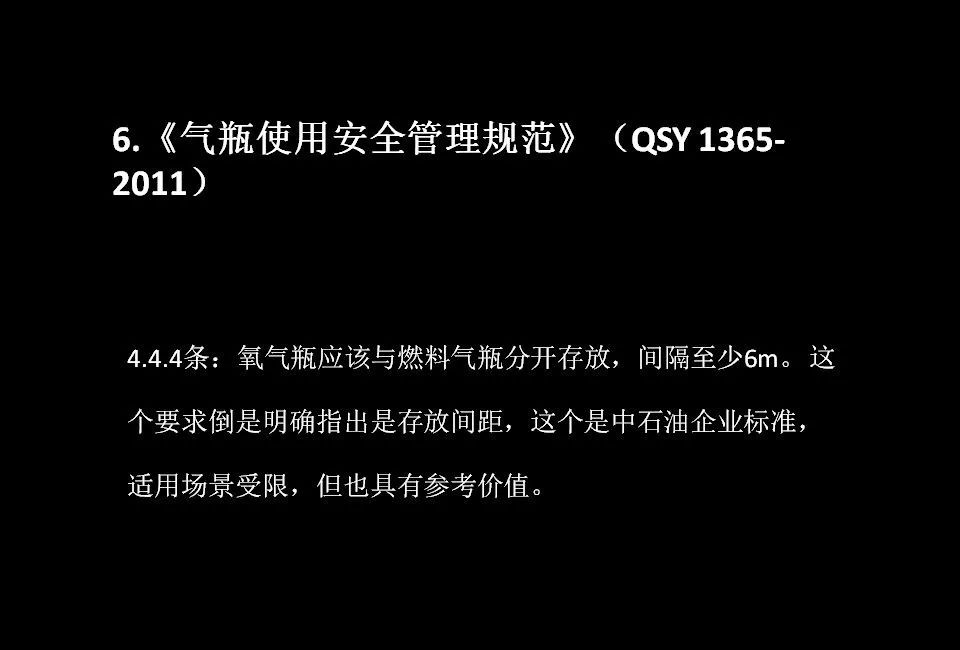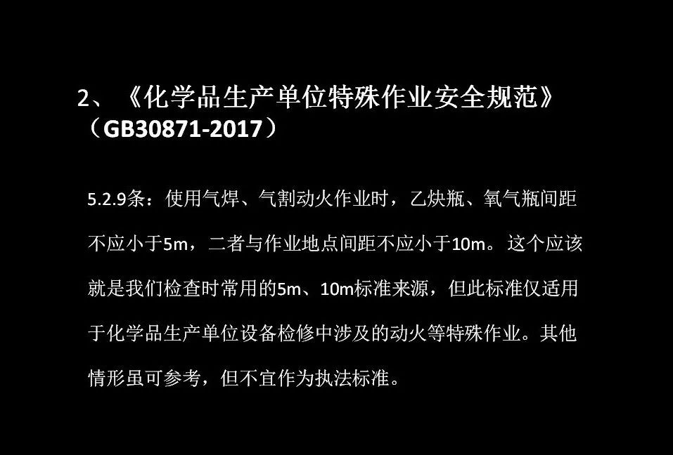 綜上,各個標準規(guī)定不盡相同,每個標準都有其適用范圍,除去建筑、電力、化工這些行業(yè)另有規(guī)定,在一般工貿(mào)行業(yè),可適用《焊接與切割安全》和《常用危險化學品貯存通則》,則乙炔、氧氣瓶之間存放距離不低于2m,氣瓶與明火距離5m以上。