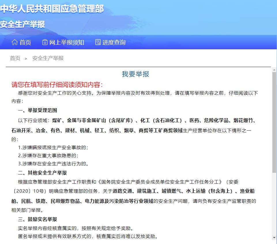為做好安全生產(chǎn)舉報(bào)工作,為社會(huì)公眾和企業(yè)員工提供便捷、快速、有效的舉報(bào)渠道,應(yīng)急管理部組織開(kāi)發(fā)的“安全生產(chǎn)舉報(bào)系統(tǒng)”于日前上線試運(yùn)行,以發(fā)動(dòng)各方面力量群策群力參與安全生產(chǎn)共治,有效防范遏制重特大事故發(fā)生。